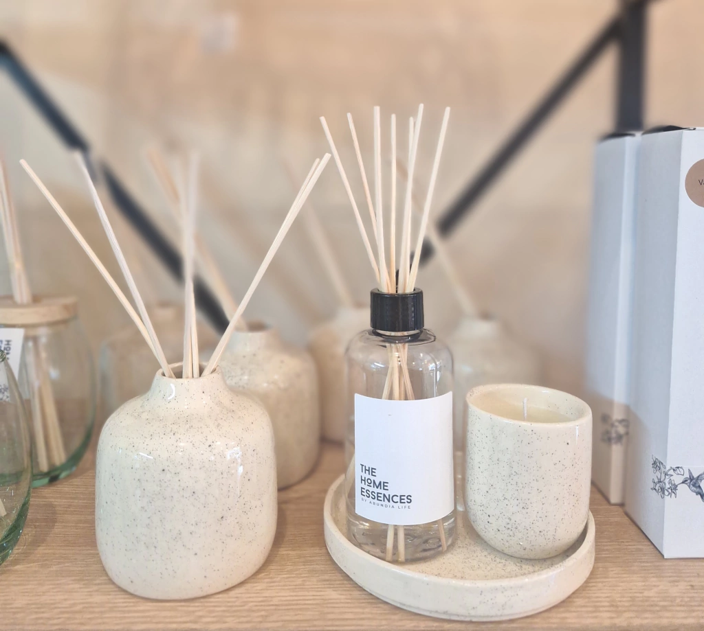 Recipiente de cerámica artesanal más varillas de ratan más esencia a elección más flor difusora
